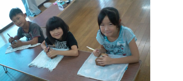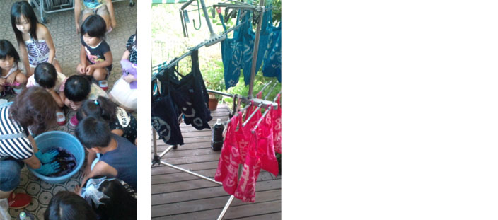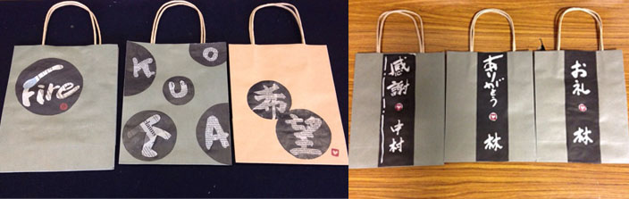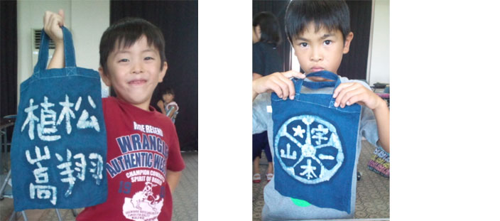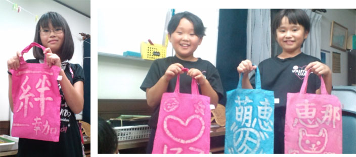 布バックにローソク液で文字を書き、染め液につけこみ、定着液をくぐらせて干してアイロンをかけます。