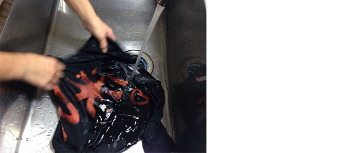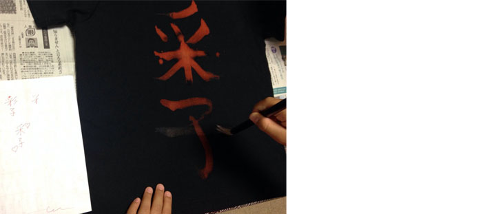 使いふるしの筆にハイター液をつけて、Tシャツに文字を書く