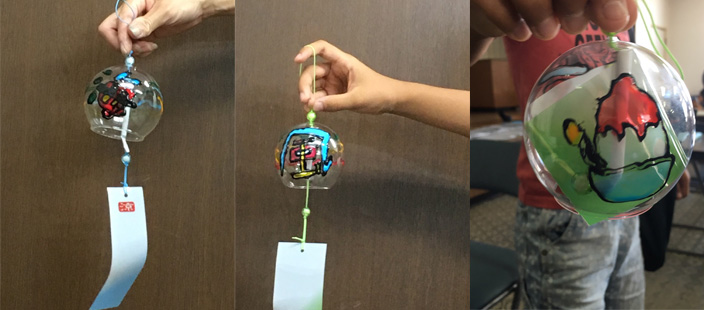 カラフルな提灯にローソク液の文字を貼り付けます。LEDライトをつけて灯りをともせます。